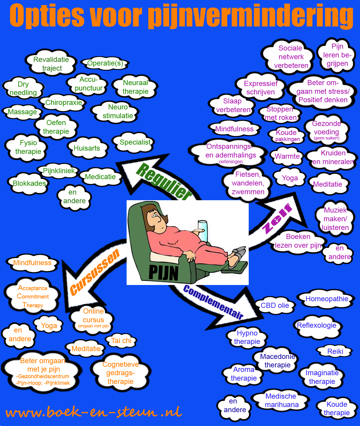 Let wel: je kunt chronische pijn bijna nooit door één behandeling genezen. Door een bepaalde operatie gaat zelden of nooit alle pijn weg, en ook een bepaald medicijn zal jouw pijn niet laten verdwijnen. En dat resultaat zal je hoogstwaarschijnlijk ook niet bereiken door één aspect van je leven te veranderen. Je zult dus bijvoorbeeld niet door te stoppen met roken al je pijn laten verdwijnen. Ook niet door gezonder te eten. Kurkumapillen, cbd-olie of mindfulness zal de pijn niet als sneeuw voor de zon laten smelten. Net als meditatie, yoga, expressief schrijven, muziek maken, creatief bezig zijn en acupunctuur dat waarschijnlijk niet kunnen. Maar stel je nu voor dat dit soort hulpjes en aanpassingen in je dagelijkse leven elk slechts—laten we zeggen—5% verbetering geeft, een positief stapje dat je waarschijnlijk op zich nauwelijks zou opmerken. Maar dat je door de cijfers van meerdere opties bij elkaar op te tellen misschien wel tot een verbetering van 25-50% kunt komen. Dan wordt het wel degelijk de moeite waard, want dan wordt de stap in de goede richting opeens wel heel groot. De lijst van potentiële positieve stapjes is heel lang, en uiteraard is niet alles voor iedereen geschikt of werkzaam. Maar uitproberen kan altijd, en wat heb je nu helemaal te verliezen? Bekijk hieronder daarom eens rustig de tekening van alle opties, en lees daarna dit verhaal verder. Laat je bij het bekijken van de afbeelding niet ontmoedigen door het wirwar van mogelijkheden waardoor je door de bomen het bos niet meer kunt zien. Kijk er eens rustig naar, en morgen en volgende week gewoon nog eens. Haal er een voor een die keuzemogelijkheden uit die jou aanspreken.